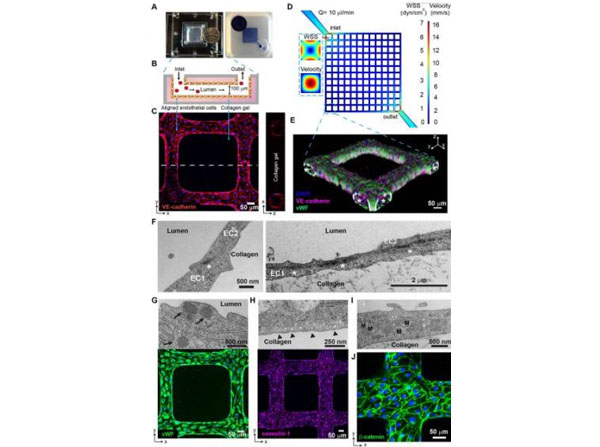 Characterization of 3D brain microvessels. (A) (Left) Photo of an assembled 3D microvessel device with a dime (diameter, 17.9?mm). (Right) 3D microvessels perfused with food dye. (B) Schematic cross-sectional view of the 3D microvessels. (C) Immunofluorescence assay (IFA) z-projection of confocal sections of a 3D brain microvessel (left) and cross-sectional view (right) labeled with anti-VE-cadherin (red) and DAPI (blue). (D) Mid-plane flow velocity (z?=?50?μm) and estimated WSS (z?=?0?μm) distributions in the grid geometry, simulated with COMSOL prior to collagen remodeling by HBMEC (see Materials and Methods). Inlaid cross-sectional views represent the lumen at the first branch after the inlet. (E) 3D reconstruction of a grid portion. Colors indicate anti-VE-cadherin antibody (red), anti-VWF antibody (green), and DAPI (blue). Asterisk, lumen. (F) Transmission electron microscopy (TEM) showing endothelial junctions and focal contacts. EC1 and EC2, endothelial cells 1 and 2; asterisk, electron-dense contacts. (G) TEM showing Weibel-Palade bodies (arrows, top) and IFA z-projection of VWF (green, bottom). (H) TEM image of polarized caveolae (arrowheads, top) and IFA z-projection of caveolin-1 (magenta, bottom). (I) TEM image reveals high mitochondrial (M) content of HBMEC. (J) IFA z-projection of adherens junctions stained with anti-β-catenin antibody (green). Nuclei in panels G, H, and J were stained with DAPI (blue). Rat tail (p/n RT-T297). Fig 1. PMID: 31138740.