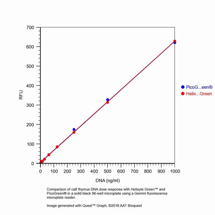 Peterson EJ, Kireev D, Moon AF, Midon M, Janzen WP, Pingoud A, Pedersen LC, Singleton SF.. (2013). Inhibitors of Streptococcus pneumoniae surface endonuclease EndA discovered by high-throughput screening using a PicoGreen fluorescence assay. J Biomol Screen, 18, 247. Chen Y, Sonnaert M, Roberts SJ, Luyten FP, Schrooten J.. (2012). Validation of a PicoGreen-based DNA quantification integrated in an RNA extraction method for two-dimensional and three-dimensional cell cultures. Tissue Eng Part C Methods, 18, 444. Moreno LA, Cox KL.. (2010). Quantification of dsDNA using the Hitachi F-7000 Fluorescence Spectrophotometer and PicoGreen dye. J Vis Exp., . Dragan AI, Casas-Finet JR, Bishop ES, Strouse RJ, Schenerman MA, Geddes CD.. (2010). Characterization of PicoGreen interaction with dsDNA and the origin of its fluorescence enhancement upon binding. Biophys J, 99, 3010. Dragan AI, Bishop ES, Casas-Finet JR, Strouse RJ, Schenerman MA, Geddes CD.. (2010). Metal-enhanced PicoGreen fluorescence: application to fast and ultra-sensitive pg/ml DNA quantitation. J Immunol Methods, 362, 95. Abiodun OO, Gbotosho GO, Ajaiyeoba EO, Happi CT, Hofer S, Wittlin S, Sowunmi A, Brun R, Oduola AM.. (2010). Comparison of SYBR Green I-, PicoGreen-, and [3H]-hypoxanthine-based assays for in vitro antimalarial screening of plants from Nigerian ethnomedicine. Parasitol Res, 106, 933. Holden MJ, Haynes RJ, Rabb SA, Satija N, Yang K, Blasic JR, Jr.. (2009). Factors affecting quantification of total DNA by UV spectroscopy and PicoGreen fluorescence. J Agric Food Chem, 57, 7221. Ikeda Y, Iwakiri S, Yoshimori T.. (2009). Development and characterization of a novel host cell DNA assay using ultra-sensitive fluorescent nucleic acid stain "PicoGreen". J Pharm Biomed Anal, 49, 997. Ren X, Xu QH.. (2009). Label-free DNA sequence detection with enhanced sensitivity and selectivity using cationic conjugated polymers and PicoGreen. Langmuir, 25, 43. Noothi SK, Kombrabail M, Kundu TK, Krishnamoorthy G, Rao BJ.. (2009). Enhanced DNA dynamics due to cationic reagents, topological states of dsDNA and high mobility group box 1 as probed by PicoGreen. FEBS J, 276, 541. Otawa K, Satoh H, Kanai Y, Onuki M, Mino T.. (2008). Rapid quantification of total viral DNA in the supernatants of activated sludge samples with the fluorescent dye PicoGreen. Lett Appl Microbiol, 46, 434. Koba M, Szostek A, Konopa J.. (2007). Limitation of usage of PicoGreen dye in quantitative assays of double-stranded DNA in the presence of intercalating compounds. Acta Biochim Pol, 54, 883. Gagna CE, Kuo HR, Chan NJ, Mitacek EJ, Spivak A, Pasquariello TD, Balgobin C, Mukhi R, Lambert WC.. (2007). Novel DNA staining method and processing technique for the quantification of undamaged double-stranded DNA in epidermal tissue sections by PicoGreen probe staining and microspectrophotometry. J Histochem Cytochem, 55, 999.