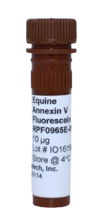 Annexins are important in various cellular and physiological processes such as providing a membrane scaffold, which is relevant to changes in the physical shape of the cell. Annexin proteins have been shown to be involved in trafficking and organization of vesicles, exocytosis, endocytosis and also calcium ion channel formation. Annexin proteins are not exclusively intracellular protein: Annexin proteins are also found in the extracellular space and have been linked to several processes fibrinolysis, coagulation, inflammation and apoptosis. Annexin proteins are all capable of binding negatively charged phospholipids in a calcium dependent manner and contain a 70 amino acid repeat sequence called an annexin repeat. Equine Annexin V Fluorescein has a predicted molecular weight of 36.0 kDa. Protein Sequence: MAQVLKGTVT DFPGFDERAD AEVLRKAMKG LGTDEESILT LLTSRSNAQR QEIAVAFKTL FGRDLLDDLK SELTGKFEKL IVALMKPSRL YDAYELKHAL KGAGTNEKVL TEIIASRTPA ELRAIKQVYE EEYGSNLEDD VVADTSGFYQ RMLVVLLQAN RDPDAGIDEA QVEQDAQTLF QAGELKWGTD EEKFITIFGT RSVSHLRRVF DKYMTISGFQ IEETIDRETS GNLEQLLLAV VKSIRSIPAY LAETLYYAMK GAGTDDHTLI RVVVSRSEID LFNIRKEFRK NFATSLYSMI KSDTSGDYKK ALLLLCGGED D (321). Made in the USA
