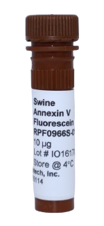 Annexins are important in various cellular and physiological processes such as providing a membrane scaffold, which is relevant to changes in the physical shape of the cell. Annexin proteins have been shown to be involved in trafficking and organization of vesicles, exocytosis, endocytosis and also calcium ion channel formation. Annexin proteins are not exclusively intracellular protein: Annexin proteins are also found in the extracellular space and have been linked to several processes fibrinolysis, coagulation, inflammation and apoptosis. Annexin proteins are all capable of binding negatively charged phospholipids in a calcium dependent manner and contain a 70 amino acid repeat sequence called an annexin repeat. Swine Annexin V Fluorescein has a predicted molecular weight of 36.0 kDa. Protien Sequence: MAQVLRGTVT DFPGFDERAD AETLRKAMKG LGTDEESILT LLTSRSNAQR QEIAVAFKTL FGRDLLDDLK SELTGKFEKL IVALMKPSRL YDAYELKHAL KGAGTDEKIL TEIIASRTPE ELRAIKQVYE EEYGSSLEDD VVGDTSGYYQ RMLVVLLQAN RDPDGRIDEA QVEQDAQALF QAGELKWGTD EEKFITILGT RSVSHLRRVF DKYMTISGFQ IEETIDRETS GNLEQLLLAV VKSIRSIPAY LAETLYYAMK GAGTDDHTLI RVMVSRSEID LFNIRKEFRK NFATSLYSMI KGDTSGDYKK ALLLLCGGED D (321). Made in the USA