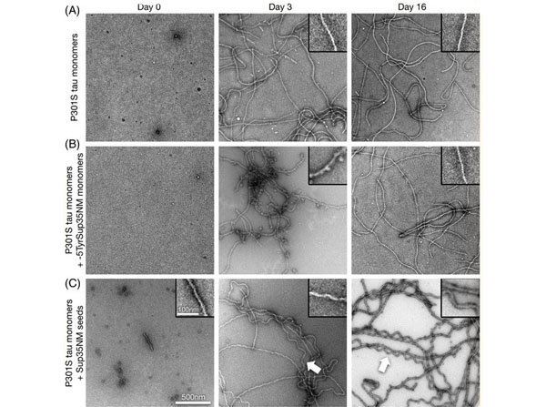 Sup35NM seeds P301S mutant tau aggregation in vitro. A‐C, Transmission electron microscope images of negatively stained preparations of human 2N4R P301S mutant tau monomer aggregates, formed under low heparin conditions (A), and after addition of ‐5TyrSup35NM monomers (B), or Sup35NM seeds (C), at days 0, 3, and 16. Note the occurrence of corkscrew‐shaped tau fibrils at days 3 and 16 upon seeding with Sup35NM fibrils (arrows, C). Scale bar for all images: 500?nm, for all magnified insets: 100?nm. Fig 1. PMID: 35142027.