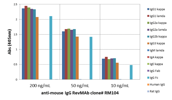 ELISA of mouse immunoglobulins shows RM104 reacted to the Fc region of mouse IgG1, IgG2a, IgG2b, and IgG3; no cross reactivity with IgM, IgA, IgE, human or rat IgG. The plate was coated with 50 ng/well of different immunoglobulins. 200 ng/mL, 50 ng/mL, or 10 ng/mL of RM104 was used as the primary antibody. An alkaline phosphatase conjugated anti-rabbit IgG as the secondary antibody.