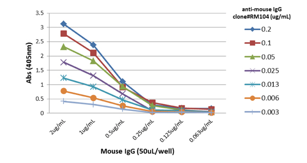A titer ELISA of mouse IgG. The plate was coated with different amounts of mouse IgG. A serial dilution of RM104 was used as the primary antibody. An alkaline phosphatase conjugated anti-rabbit IgG as the secondary antibody.