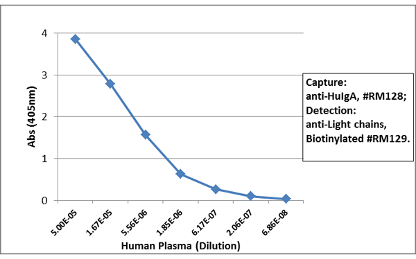 Sandwich ELISA using RM128 as the capture antibody (100ng/well), and Biotinylated anti-human light chains ( κ+ λ) antibody RM129 as the detection antibody, followed by an alkaline phosphatase conjugated streptavidin.