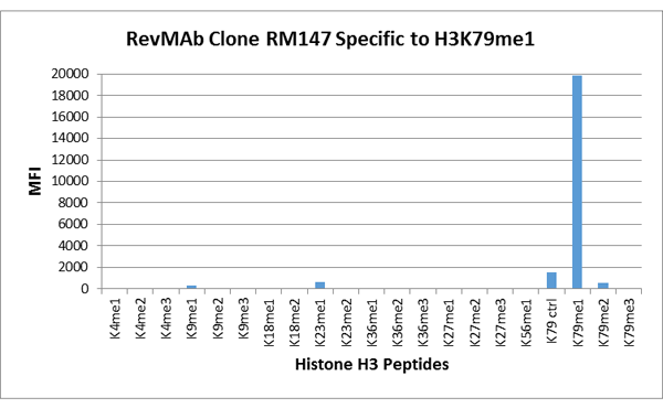 RM147 specifically reacts to Histone H3 monomethylated at Lysine 79 (K79me1). No cross reactivity with dimethylated Lysine 79 (K79me2), trimethylated Lysine 79 (K79me3), or other methylations in histone H3.