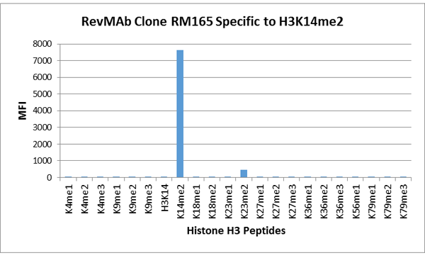 RM165 specifically reacts to Histone H3 dimethylated at Lysine 14 (K14me2). No cross reactivity with non -modified Lysine 14 (H3K14), monomethylated Lysine14 (K14me1), trimethylated Lysine 14 (K14me3), or other methylations in Histone H3.