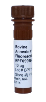Annexins are important in various cellular and physiological processes such as providing a membrane scaffold, which is relevant to changes in the physical shape of the cell. Annexin proteins have been shown to be involved in trafficking and organization of vesicles, exocytosis, endocytosis and also calcium ion channel formation. Annexin proteins are not exclusively intracellular protein: Annexin proteins are also found in the extracellular space and have been linked to several processes fibrinolysis, coagulation, inflammation and apoptosis. Annexin proteins are all capable of binding negatively charged phospholipids in a calcium dependent manner and contain a 70 amino acid repeat sequence called an annexin repeat. Bovine Annexin V was produced in yeast and therefore does not have endotoxin, is naturally folded, and post-translationally modified. Bovine Annexin V Fluorescein has a predicted molecular weight of 36.1 kDa. Protien Sequence: MAQVLRGTVA DFPGFDERAD AETLRKAMKG LGTDEETILT LLTSRSNAQR QEIAVAFKTL FGRDLLDDLK SELTGKFEKL IVALMKPSRL YDAYELKHAL KGAGTDEKVL TEIIASRTPE ELRAIEQVYE EEYGSSLEDD VVGDTSGYYQ RMLVVLLQAN RDPDARIDEA QVEQDAQALF QAGELKWGTD EEKFITIFGT RSVSHLRRVF DKYMTISGFQ IEETIDRETS GNLEQLLLAV VKSIRSIPAY LAETLYYAMK GAGTDDHTLI RVVVSRSEID LYNIRKEFRK NFGTSLYSMI KGDTSGDYKK ALLLLCGGED D (321). Made in the USA