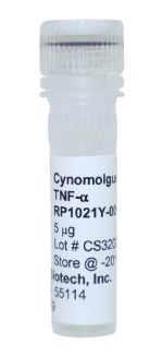 The Cynomolgus Monkey TNF alpha yeast-derived recombinant protein is not tagged and is naturally endotoxin-free. The purity is greater than 98% as visualized by SDS-PAGE analysis. Cynomolgus Monkey TNF alpha applications are for cell culture, ELISA standard, and Western Blot Control. Cynomolgus Monkey TNF alpha yeast-derived recombinant protein can be purchased in multiple sizes. Cynomolgus Monkey TNF alpha Specifications: (Molecular Weight: 17.3 kDa) (Amino Acid Sequence: VRSSSRTPSD KPVAHVVANP QAEGQLQWLN RRANALVANG VELTDNQLVV PSEGLYLIYS QVLFKGQGCP SNHVLLTHTI SRIAVSYQTK VNLLSAIKSP CQRETPEGAE AKPWYEPIYL GGVFQLEKGD RLSAEINLPD YLDFAESGQV YFGIIAL (157)) (Gene ID: 102139631). For research use only. Made in the USA