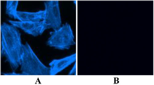 図1. 本キット(品番22660)を用いて染色したCPA細胞(ホルマリン固定) (A) iFluor? 350-Phalloidin で30 分間染色した。 (B) phalloidinで10分間細胞を処理した後、iFluor? 350-Phalloidinで30分間染色した。