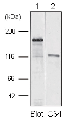 Fig.1 Western blot analysis TritonX-100 insoluble cytoskeletal fraction (lane 1) and concentrated conditioned medium (lane 2) prepared from DJM-1 cells were immunoblotted with the C34 antibody (1:200 dilution). The C34 antibody detected a band at approximately 180 kDa in lane 1. This antibody also reacted with a 120-kDa shed ectodomain of BP180 in lane 2. Polypeptiedes were separated by SDS-PAGE (7.5% separating gel).