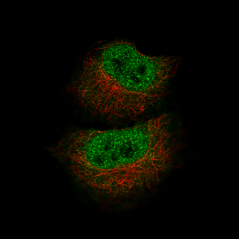 Immunofluorescence staining of A549 cells using the Anti-MBP monoclonal antibody, showing specific staining in the nucleoplasm in green. Microtubule- and nuclear probes are visualized in red and blue, respectively (where available).