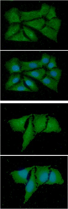 ICC/IF analysis of MIF in HeLa cells line, stained with DAPI (Blue) for nucleus staining and monoclonal anti-human MIF antibody (1:100) with goat anti-mouse IgG-Alexa fluor 488 conjugate (Green).