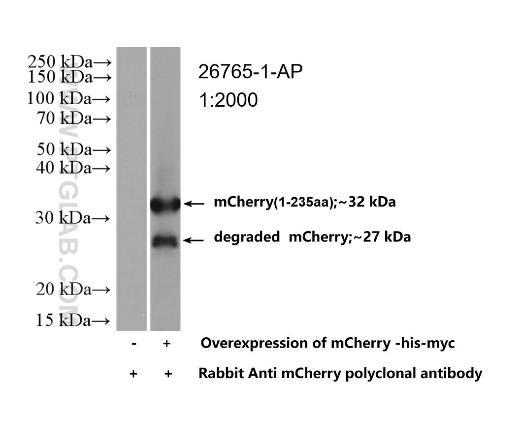 The mCherry antibody from Proteintech is a rabbit polyclonal antibody to a recombinant protein. This antibody recognizes recombinant protein antigen. The mCherry antibody has been validated for the following applications: WB, IF/ICC, IP, ELISA analysis.