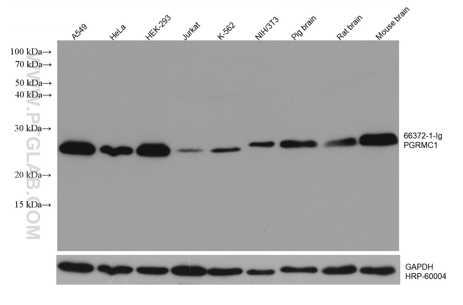 The PGRMC1 antibody from Proteintech is a mouse monoclonal antibody to a recombinant protein of human PGRMC1. This antibody recognizes human, mouse, rat, pig antigen. The PGRMC1 antibody has been validated for the following applications: WB, IHC, IF/ICC, IF-P, ELISA analysis.
