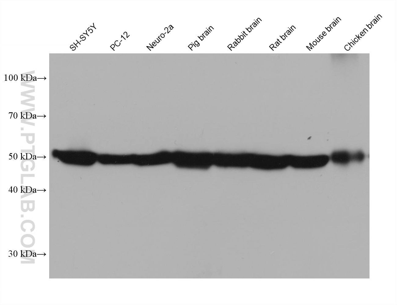 The TUBB3-specific/TUJ1 antibody from Proteintech is a mouse monoclonal antibody to a peptide of human TUBB3-specific/TUJ1. This antibody recognizes human, mouse, rat, pig, rabbit, chicken antigen. The TUBB3-specific/TUJ1 antibody has been validated for the following applications: WB, IHC, IF/ICC, IF-P, FC (Intra), ELISA analysis.