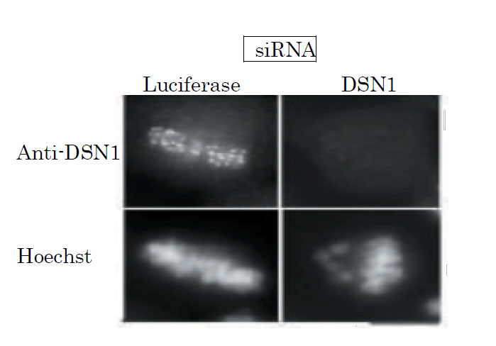 Fig.2 Immunofluorescence staining of HeLa cell chromosome with this antibody. Expression of siRNA for DSN1 for 24 h greatly reduced DSN expression in the cell. Luciferase siRNA was used as a control. Antibody was used at 1/1,000 dilution. Mitotic cells were accumulated by nocodazole treatment and chromosomes were spread on coverglass.