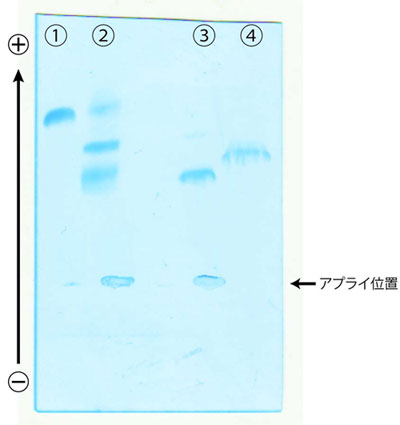 図1 検出実験例 1.デルマタン硫酸(2 μg/μL)、2.ムチン ブタ胃由来(10 μg/μL)、3.ムチン ウシ顎下腺由来(5 μg/μL)、4.ヒアルロン酸(0.25 μg/μL)。アプライ量は各1 μL。