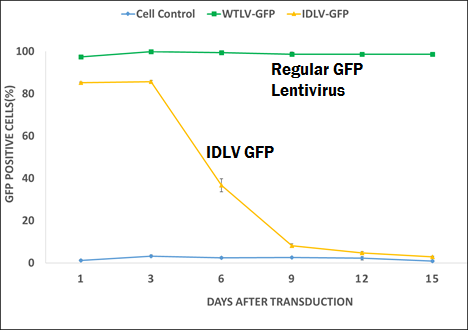 GFP lentivirus transduced HEK293 cells, normal lentivirus (WT) or integration-deficient (IDLV). GFP positive cells were measured with FACS sorting.
