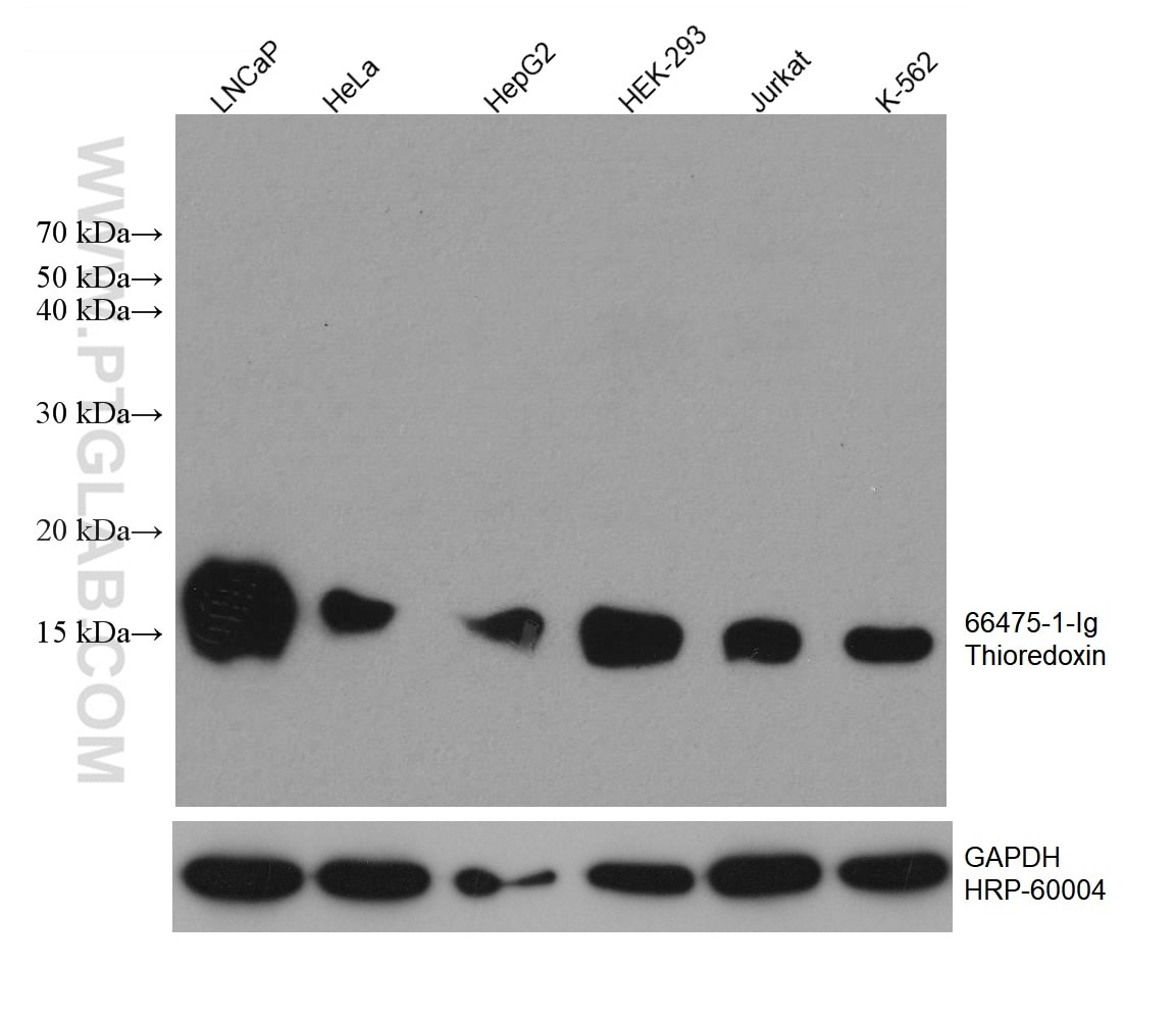 The Thioredoxin antibody from Proteintech is a mouse monoclonal antibody to a recombinant protein of human Thioredoxin. This antibody recognizes human antigen. The Thioredoxin antibody has been validated for the following applications: WB, IHC, IF/ICC, ELISA analysis.