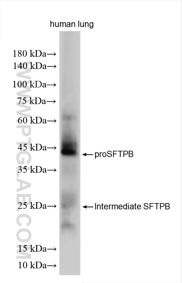The SFTPB antibody from Proteintech is a rabbit polyclonal antibody to a recombinant protein of human SFTPB. This antibody recognizes human antigen. The SFTPB antibody has been validated for the following applications: WB, IHC, ELISA analysis.