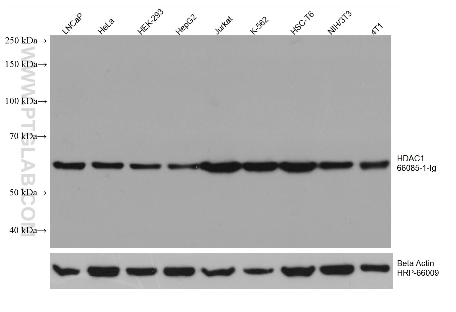 The HDAC1 antibody from Proteintech is a mouse monoclonal antibody to a recombinant protein of human HDAC1. This antibody recognizes human, mouse, rat antigen. The HDAC1 antibody has been validated for the following applications: WB, IHC, IF/ICC, ELISA analysis.