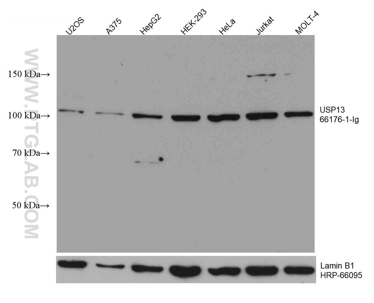 The USP13 antibody from Proteintech is a mouse monoclonal antibody to a recombinant protein of human USP13. This antibody recognizes human antigen. The USP13 antibody has been validated for the following applications: WB, IHC, IF/ICC, ELISA analysis.