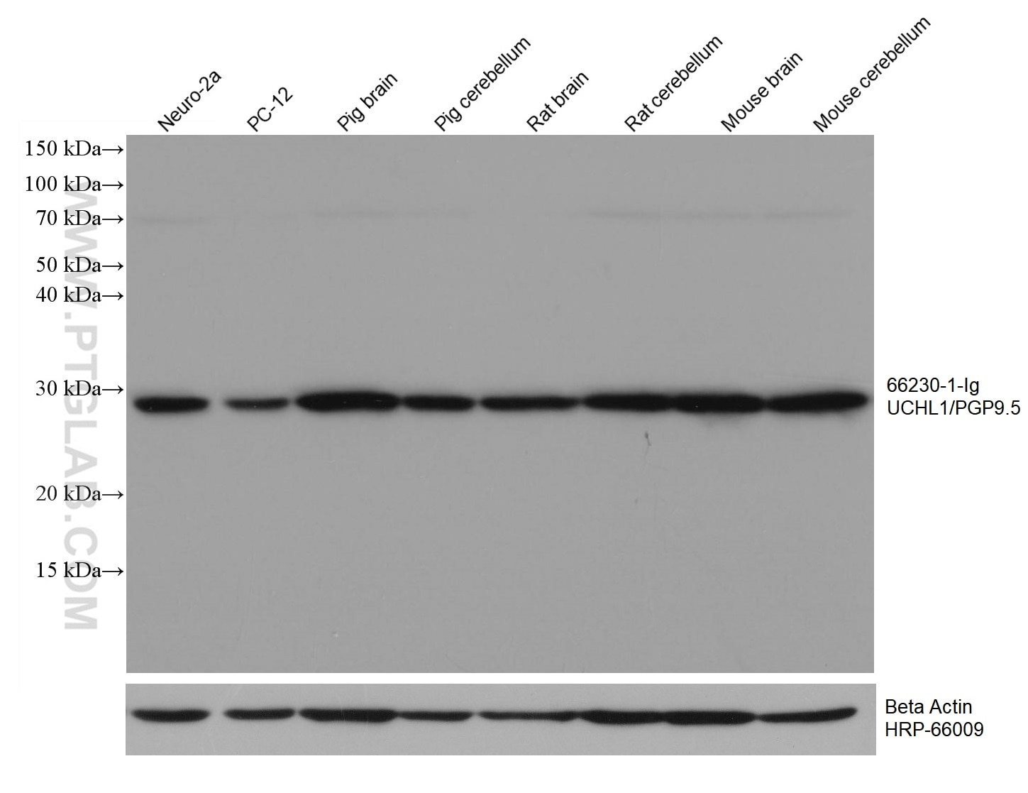The UCH-L1/PGP9.5 antibody from Proteintech is a mouse monoclonal antibody to a recombinant protein of human UCH-L1/PGP9.5. This antibody recognizes human, mouse, rat, pig antigen. The UCH-L1/PGP9.5 antibody has been validated for the following applications: WB, IHC, IF/ICC, FC (Intra), ELISA analysis.