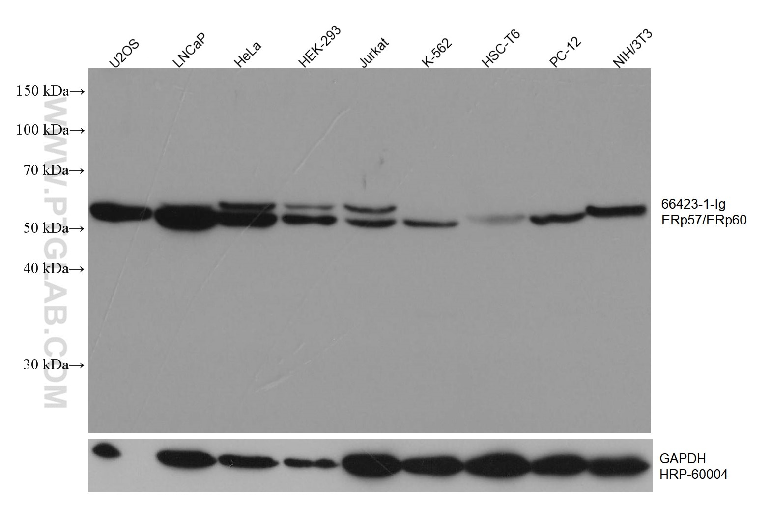 The ERp57/ERp60 antibody from Proteintech is a mouse monoclonal antibody to a recombinant protein of human ERp57/ERp60. This antibody recognizes human, mouse, rat antigen. The ERp57/ERp60 antibody has been validated for the following applications: WB, IHC, IF/ICC, ELISA analysis.
