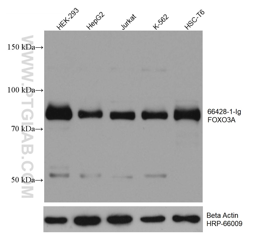 The FOXO3A antibody from Proteintech is a mouse monoclonal antibody to a recombinant protein of human FOXO3A. This antibody recognizes human, mouse, rat antigen. The FOXO3A antibody has been validated for the following applications: WB, IHC, IF/ICC, IP, ELISA analysis.