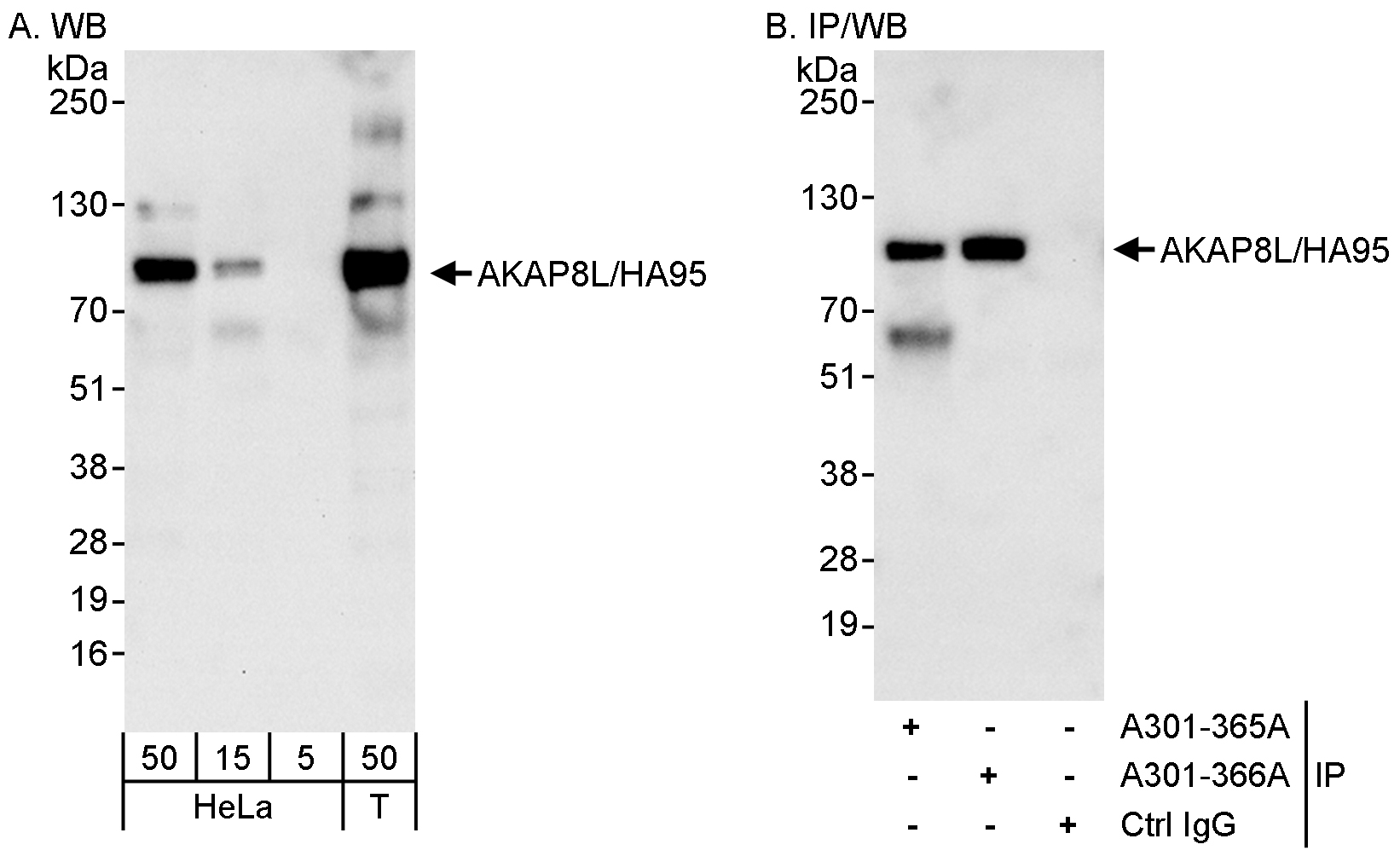 Helicase A-binding protein 95; testis tissue sperm-binding protein Li 90mP; Neighbor of A-kinase-anchoring protein 95; neighbor of A-kinase anchoring protein 95; neighbor of AKAP95; NAKAP95; NAKAP; homologous to AKAP95 protein; HAP95; HA95; A-kinase anchor protein 8-like; AKAP8-like protein; A kinase (PRKA) anchor protein 8-like; helicase A-binding protein 95 kDa