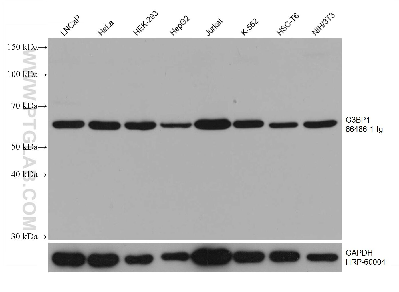 The G3BP1 antibody from Proteintech is a mouse monoclonal antibody to a recombinant protein of human G3BP1. This antibody recognizes human, mouse, rat, pig antigen. The G3BP1 antibody has been validated for the following applications: WB, IHC, IF/ICC, ELISA analysis.