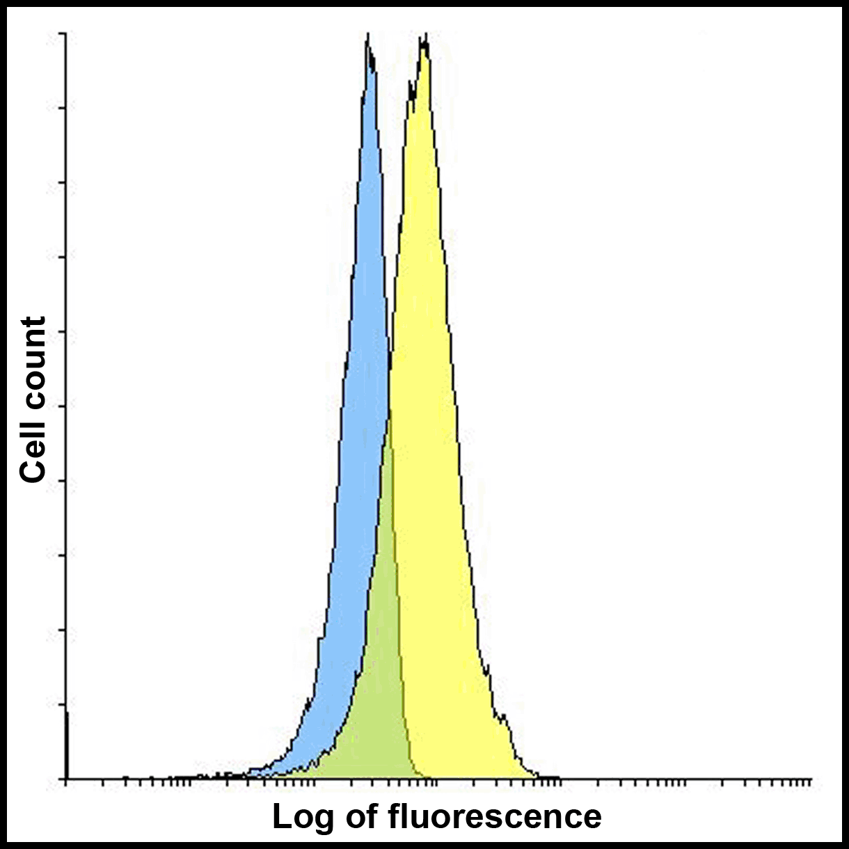 Flow cytometry analysis of PD-L1 overexpressing HEK293 cells using PD-L1 antibody and control mouse IgG antibody at 10 μg/ml. Blue: Untransfected HEK293 cells. Yellow: PD-L1 overexpressing HEK293 cells.