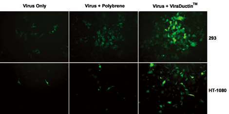 レンチウイルス形質導入効率は、一般的に低い事で知られています。Polybrene(R)等の添加剤は、形質導入効率を高めますが、多くのレンチウイルスには適応しません。セルバイオラボ社の ViraDuctinTM形質導入キットは、多くのセルラインで使用できるだけでなく、Polybrene(R)存在下にくらべ、高い形質転換効率を誇ります。 ViraDuctinTMシステムは、初代培養細胞および幹細胞でもご使用いただけます。