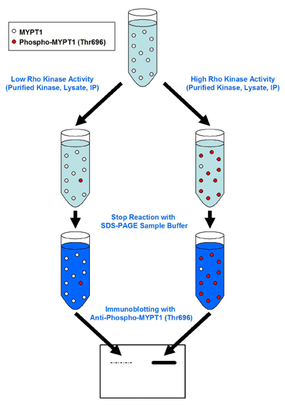 Rho-associated Kinase (ROCK) mediates Rho signaling and reorganizes the actin cytoskeleton by phosphorylation of several substrates that contribute to the assembly of actin filaments and contractility. ROCK inactivates myosin phosphatase through the specific phosphorylation of myosin phosphatase target subunit 1 (MYPT1) at Thr-696, which results in an increase in the phosphorylated content of the 20-kDa myosin light chain (MLC20). Our ROCK Activity Immunoblot Kit uses a safe, non-radioactive format to measure the level of active Rho Kinase?in cell or tissue lysates.