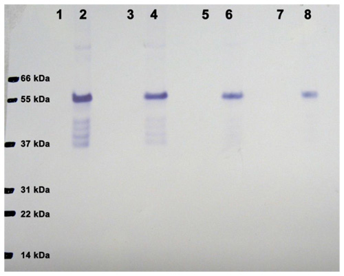 ROCK-II 活性測定イムノブロットアッセイ MYPT1基質のリン酸化をMYPT1リン酸化(Thr696)抗体で検出した。測定は添付のプロトコールに従った。 10ng の活性型ROCK-IIを含む1×キナーゼバッファー25μL、0.2mM ATPを含む1×キナーゼバッファー50μL、リコンビナントMYPT1を30℃で30分間反応させた。キナーゼの反応を、25μLの4×SDS- PAGEサンプルバッファーを加えて停止した。各レーンに下記サンプルをロードし、SDS-PAGEを行った。MYPT1のリン酸化の検出は、 MYPT1(Thr696)抗体を用いて行った。 レーン1, 3, 5, 7:キナーゼなし(ネガティブコントロール)、 レーン2, 4, 6, 8:キナーゼ200ng, 100ng, 50ng, 25ng。