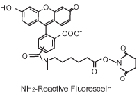 [特長]本キットは、アミノ基を有するタンパク質、特に抗体へフルオレセインを標識するためのキットである。キット付属のNH2-Reactive Fluorescein は、その分子内に活性エステル基を有しているため、アミノ基を有する標的分子と混合するだけで安定な共有結合を形成する。イムノグロブリンG(IgG)にフルオレセインを標識する場合、標識反応を阻害するような低分子化合物(トリスなど)や未反応のNH2-Reactive Fluorescein は付属のFiltration Tubeを用いて、容易 [各色素の蛍光]緑色発光