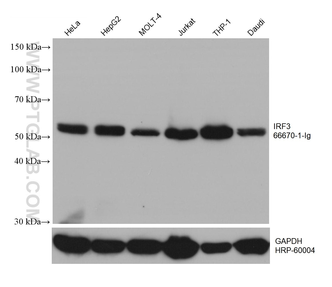 The IRF3 antibody from Proteintech is a mouse monoclonal antibody to a recombinant protein of human IRF3. This antibody recognizes human antigen. The IRF3 antibody has been validated for the following applications: WB, IHC, ELISA analysis.