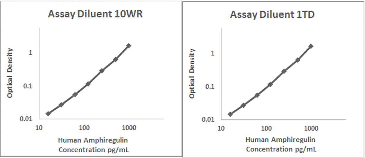 Human Amphiregulin recombinant protein was spiked into various biological samples and serial diluted with Assay Diluent 10WR for serum and/or plasma samples and Assay Diluent 1TD for RPMI 10% FBS.