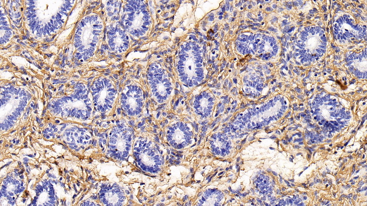 DAB staining on IHC-P; Sample: Human Uterus Tissue; Primary Ab: 20μg/ml Mouse Anti-Human COL1a1 Antibody Second Ab: 2μg/mL?HRP-Linked Caprine Anti-Mouse IgG Polyclonal Antibody (Catalog: SAA544Mu19)