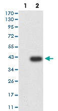 Western blot analysis of (1) HEK293 cells, (2) CCR3-hIgGFc transfected HEK293 cell lysate.