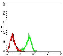 Flow cytometric analysis of HL-60 cells with CCR3 monoclonal antibody (green) and negative control (red).