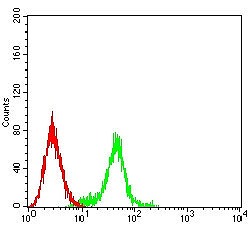 Flow cytometric analysis of Ramos cells with IL9R monoclonal antibody (green) and negative control (red).