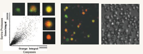 図1. HL-60 細胞懸濁液をcamptothecin で37℃、3 時間処理し、アポトーシスを誘導させた。細胞を緑色セリンプロテアーゼ検出キット(品番945)および赤色カスパーゼ検出キット(品番917)で37℃、1 時間処理し、レーザースキャンサイトメーターで解析した。 緑色蛍光:セリンプロテアーゼ活性 赤色蛍光:アポトーシス vs カスパーゼ活性 黄色:双方の重ね合わせ (データ提供:Dr. Z. Darzynkiewicz, Brander Cancer Institute, New York Medical College, NY.)