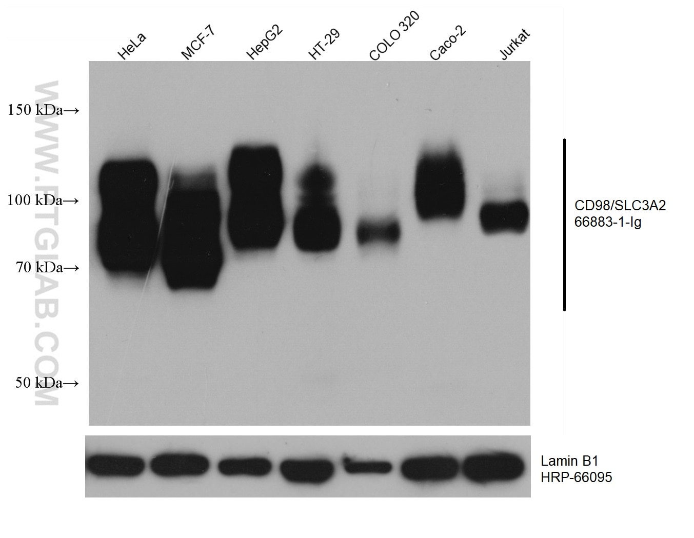 The CD98/SLC3A2 antibody from Proteintech is a mouse monoclonal antibody to a recombinant protein of human CD98/SLC3A2. This antibody recognizes human antigen. The CD98/SLC3A2 antibody has been validated for the following applications: WB, IHC, IF/ICC, ELISA analysis.