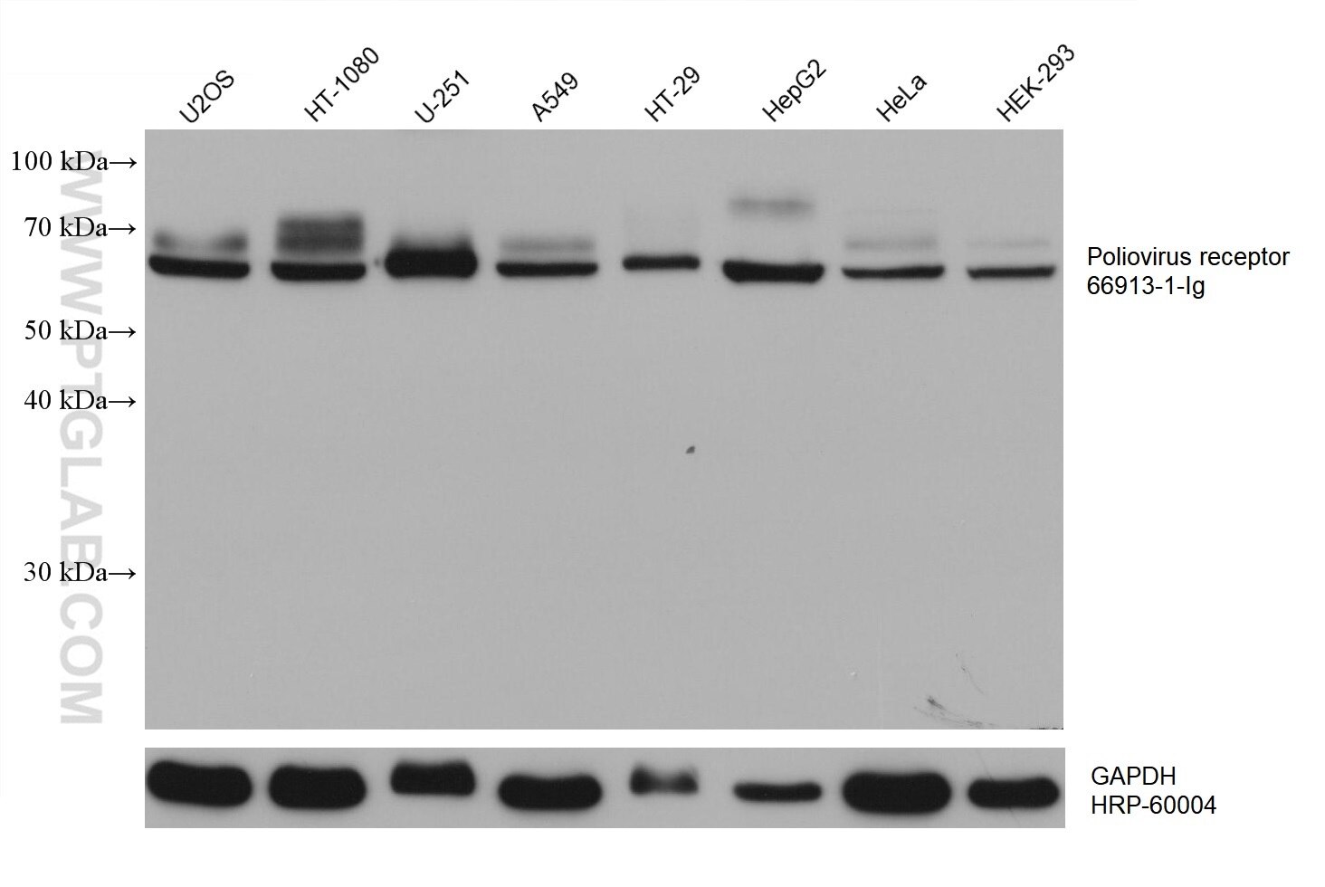 The CD155/PVR antibody from Proteintech is a mouse monoclonal antibody to a recombinant protein of human CD155/PVR. This antibody recognizes human antigen. The CD155/PVR antibody has been validated for the following applications: WB, ELISA analysis.