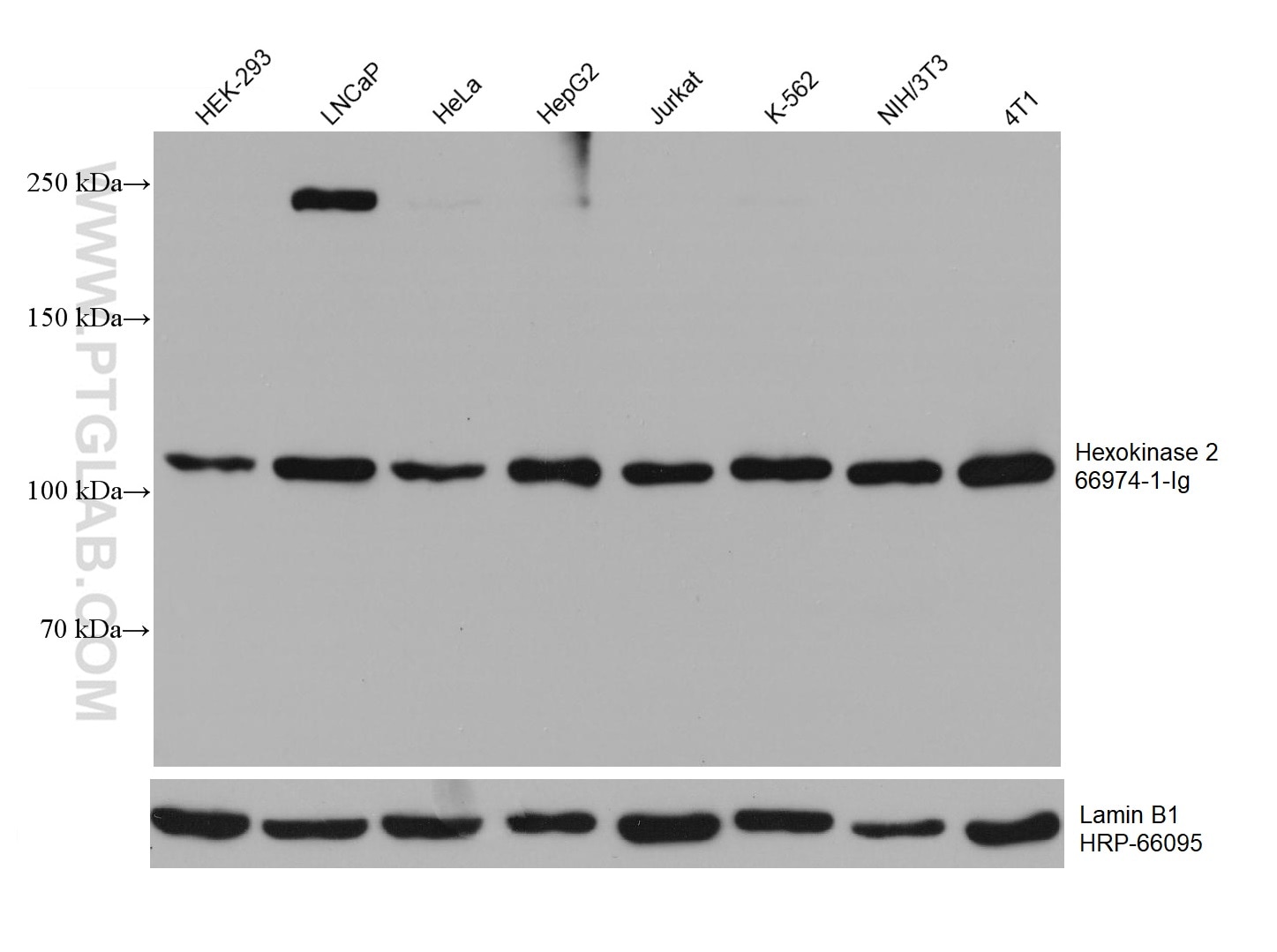 The Hexokinase 2 antibody from Proteintech is a mouse monoclonal antibody to a recombinant protein of human Hexokinase 2. This antibody recognizes human, mouse, rat antigen. The Hexokinase 2 antibody has been validated for the following applications: WB, IHC, IF/ICC, FC (Intra), ELISA analysis.