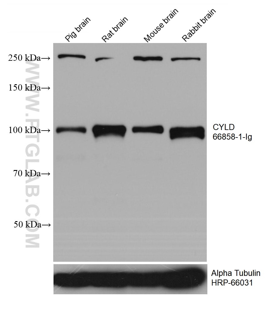 The CYLD antibody from Proteintech is a mouse monoclonal antibody to a recombinant protein of human CYLD. This antibody recognizes human, mouse, rat, pig, rabbit antigen. The CYLD antibody has been validated for the following applications: WB, IF/ICC, ELISA analysis.