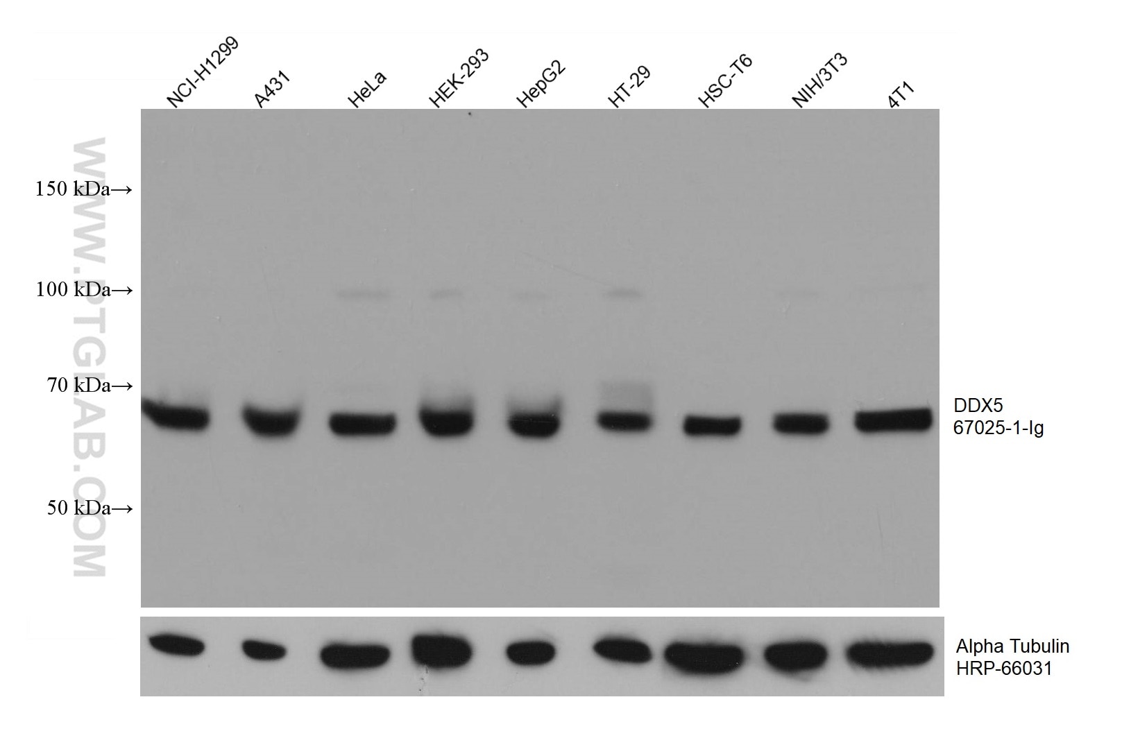 The DDX5 antibody from Proteintech is a mouse monoclonal antibody to a recombinant protein of human DDX5. This antibody recognizes human, mouse, rat antigen. The DDX5 antibody has been validated for the following applications: WB, IHC, IF/ICC, IP, ELISA analysis.
