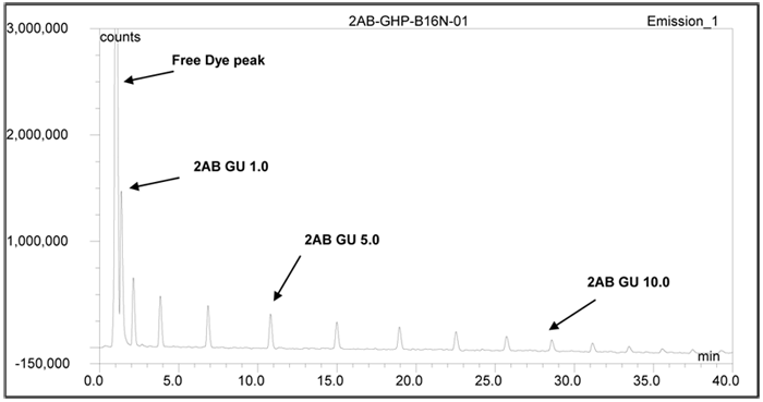 2AB labeled Glucose Homopolymer ladder(品番: CAB-GHP-30)の HILIC HPLC プロファイル例