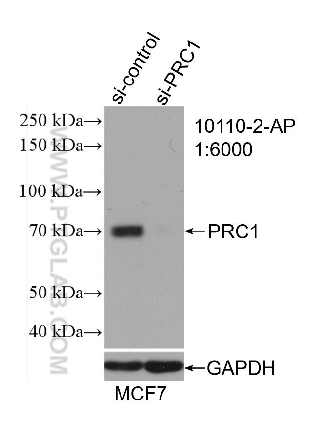 The PRC1 antibody from Proteintech is a rabbit polyclonal antibody to a recombinant protein of human PRC1. This antibody recognizes human antigen. The PRC1 antibody has been validated for the following applications: WB, IHC, ELISA analysis.